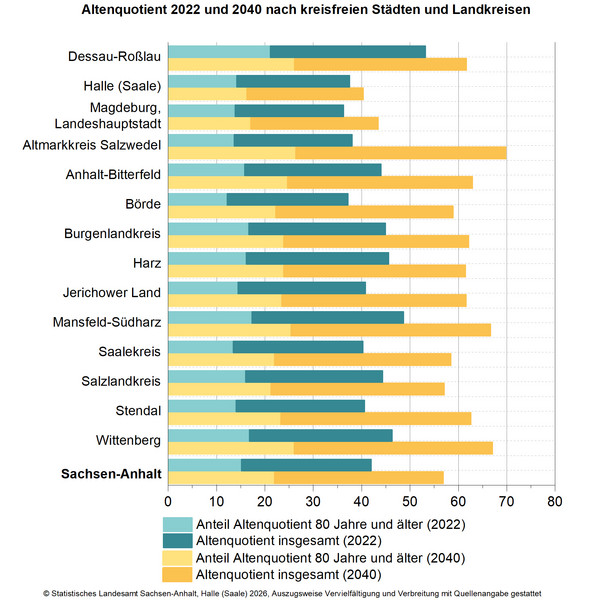 Der höchste Altenquotient wird 2040 für den Altmarkkreis Salzwedel (69,83) prognostiziert, die kreisfreie Stadt Dessau-Roßlau wird dann voraussichtlich nur noch auf dem 8. Platz (61,65) liegen. Die Großstädte Magdeburg (43,46) und Halle (Saale) (40,34) werden voraussichtlich weiterhin die niedrigsten Altenquotienten im Land aufweisen.