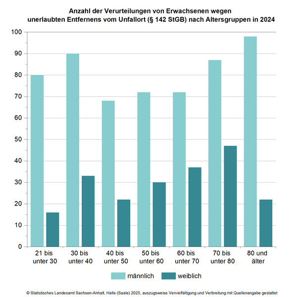 Von 2015 bis 2024 wurden von den Gerichten in Sachsen-Anhalt 45 648 Straftaten im Straßenverkehr geahndet. Davon betrafen 8 460 bzw. 18,5 % Verurteilungen wegen unerlaubten Entfernens vom Unfallort nach § 142 StGB (Fahrerflucht). 8 433 und damit der überwiegende Teil der Verurteilungen erfolgte nach allgemeinem Strafrecht. In den meisten Fällen verhängten die Gerichte dabei Geldstrafen. Bei 130 Verurteilungen wurde eine Freiheitsstrafe ausgesprochen.