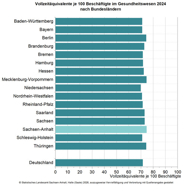 Das in Vollzeitäquivalente umgerechnete Gesundheitspersonal betrug 114,6 Tsd. Personen. Je 100 Gesamtbeschäftigten des Gesundheitswesens entsprach das 74,5 Vollzeitäquivalenten. Damit hatte Sachsen-Anhalt 2024 den höchsten Wert aller Bundesländer an Vollzeitäquivalenten je 100 Beschäftigte. Die Beschäftigten im Gesundheitswesen in Sachsen-Anhalt arbeiteten somit durchschnittlich mehr Stunden bzw. seltener in Teilzeit als in den anderen Bundesländern und in Deutschland (71,4). Besonders im Gesundheitsschutz (93,5 Vollzeitäquivalente je 100 Beschäftigte; Deutschland 84,8) und in den teil-/stationären Einrichtungen wie z. B. Krankenhäusern, Pflegeheimen sowie Vorsorge- und Rehabilitationseinrichtungen (81,0 Vollzeitäquivalente je 100 Beschäftigte; Deutschland 75,1) spielte die Teilzeitbeschäftigung in Sachsen-Anhalt eine geringere Rolle als im Durchschnitt Deutschlands.