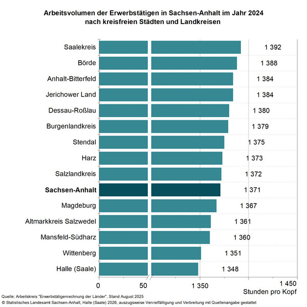 2023 betrug die jährliche Pro-Kopf-Arbeitszeit in Sachsen-Anhalt noch 1 372 Stunden (Bundesdurchschnitt 1 339 Stunden). Die Spannweite reichte innerhalb des Landes von 1 350 Stunden in der kreisfreien Stadt Halle (Saale) bis 1 393 Stunden im Saalekreis.